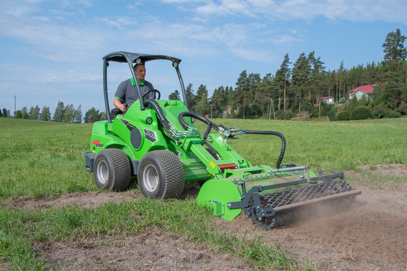 - Vertical grading rake with strong tines in front of the blades which traps stones and debris