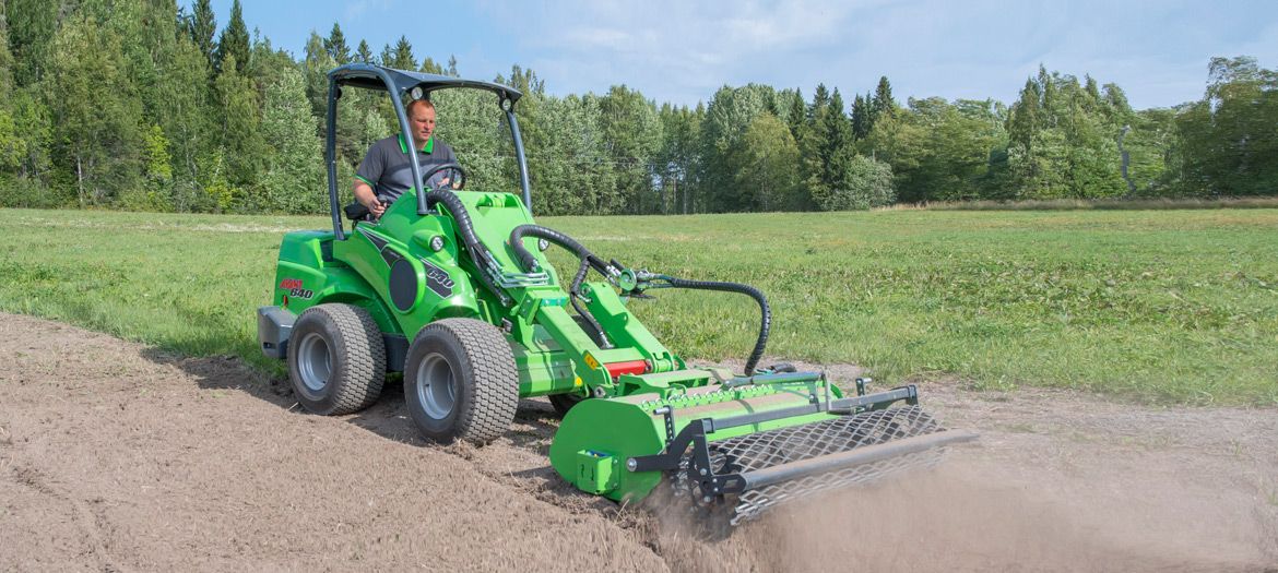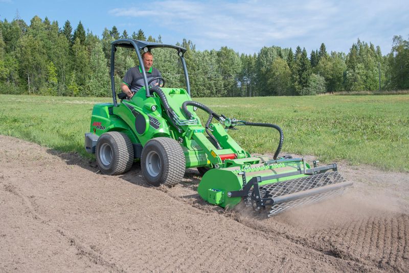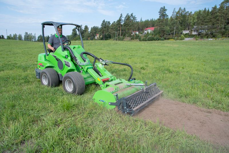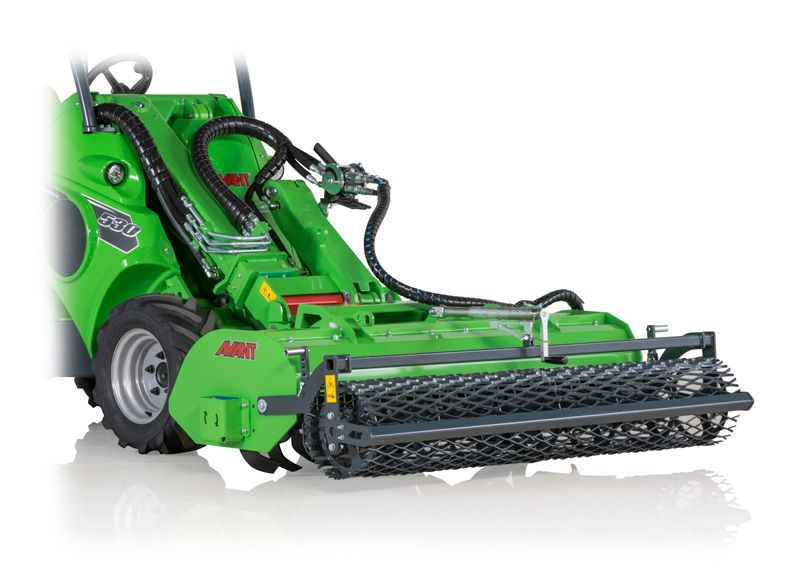 It features a direct drive with the hydraulic motor mounted directly on the milling shaft. The curved blades guarantee efficient milling of the soil. A vertical grading rake with strong tines in front of the blades traps stones and debris, effectively allowing them to be buried in the soil. This gives a finished seeding bed in a single pass. There is also an adjustable soil scraper blade between the milling shaft and the field roller. The working depth up to 150 mm is steplessly adjustable with the rear field roller.