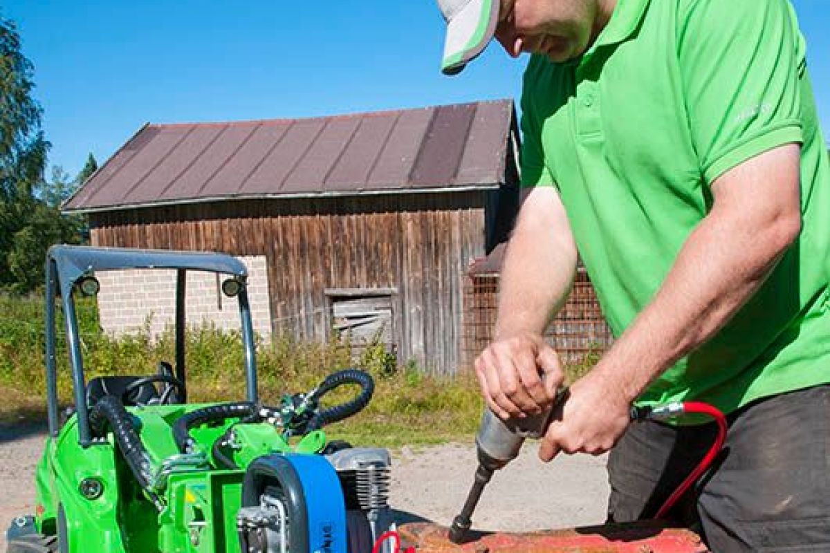 The compressor makes it possible to have compressed air anywhere you go. Creates max. 400 l/min air flow @ 8 bar pressure. Can be used for running power tools and, for example, filling of large tyres in places where electric current is not available, and for cleaning of big machines like combined harvesters etc.