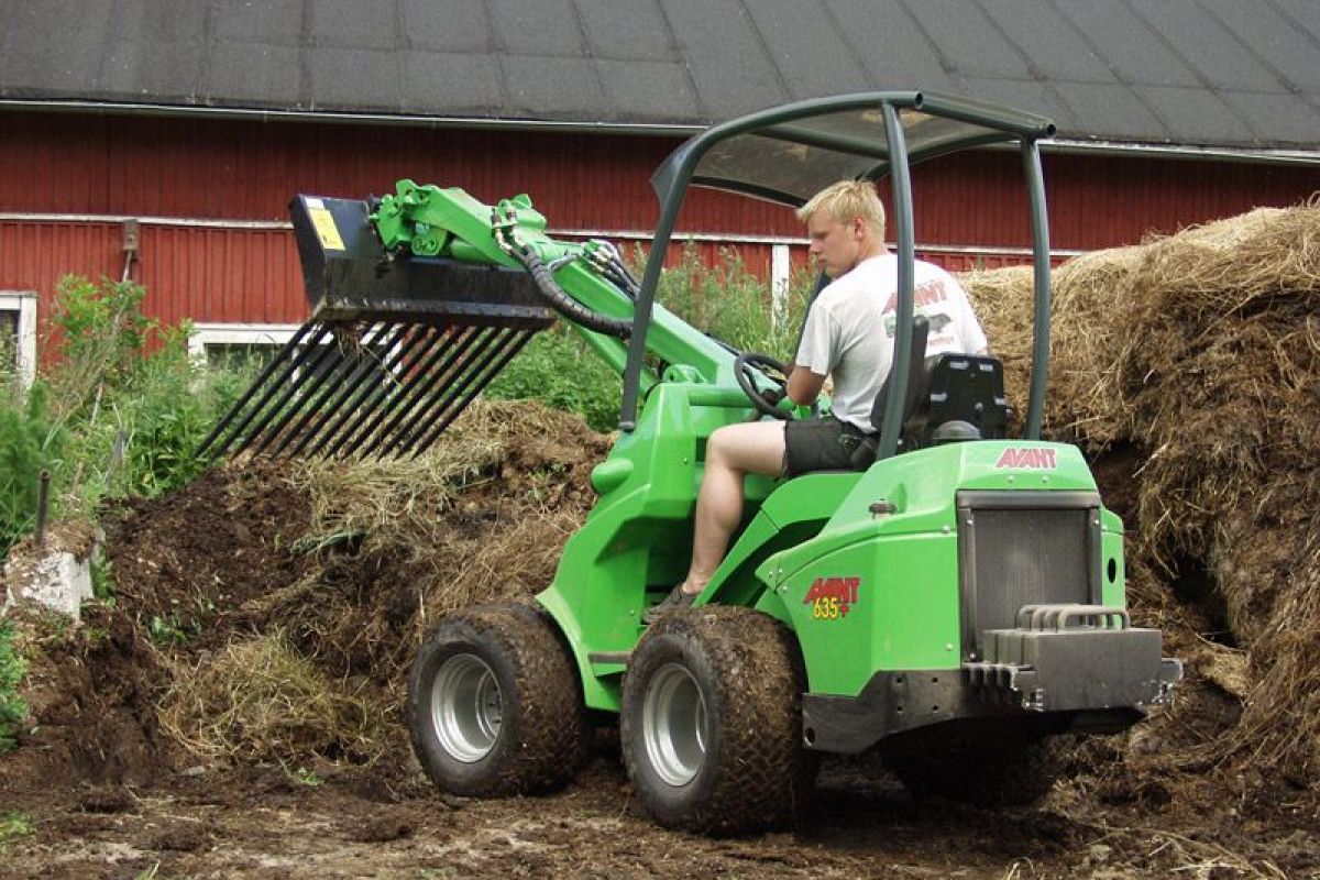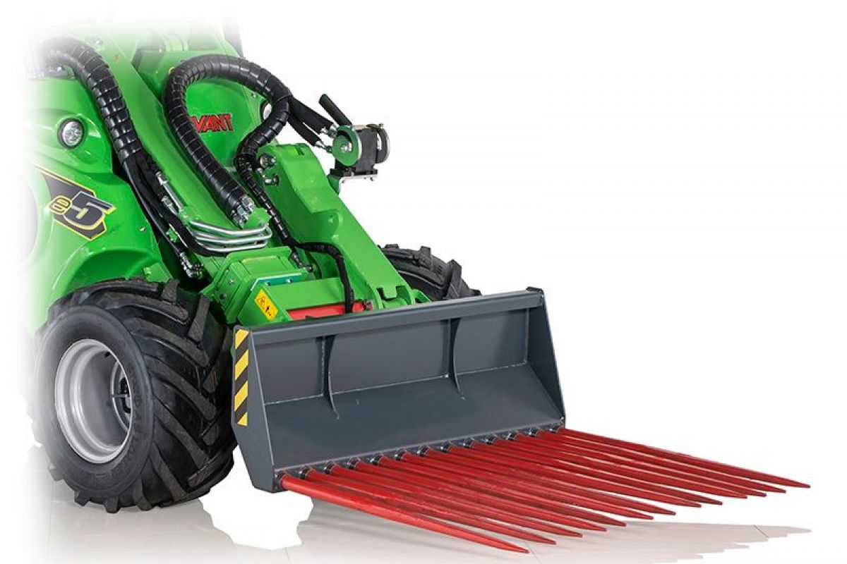 Avant manure fork is a very useful attachment, destined for detaching and handling of manure and similar materials. The strong tines, made of high tensile forged steel, penetrate also into compacted manure and can carry a heavy load.