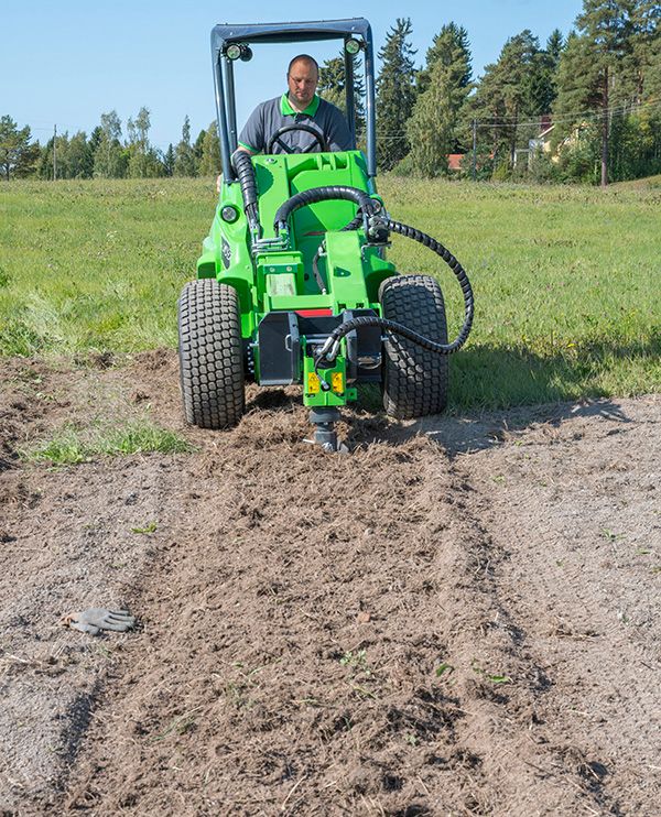 • Auger drills and screw pile adapter are mounted on the drive unit like before, in addition following attachments can be fitted: Concrete mixing drum, Screw cone log splitter, Screening drum, Cable/hose reel, Carousel broom, Rotary hoe, Angle adapter 90°, XL weed brush, XL wire rope brush