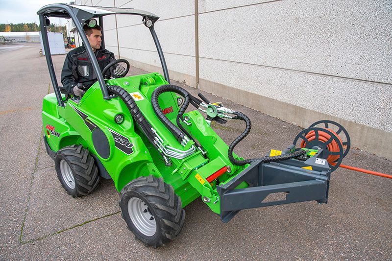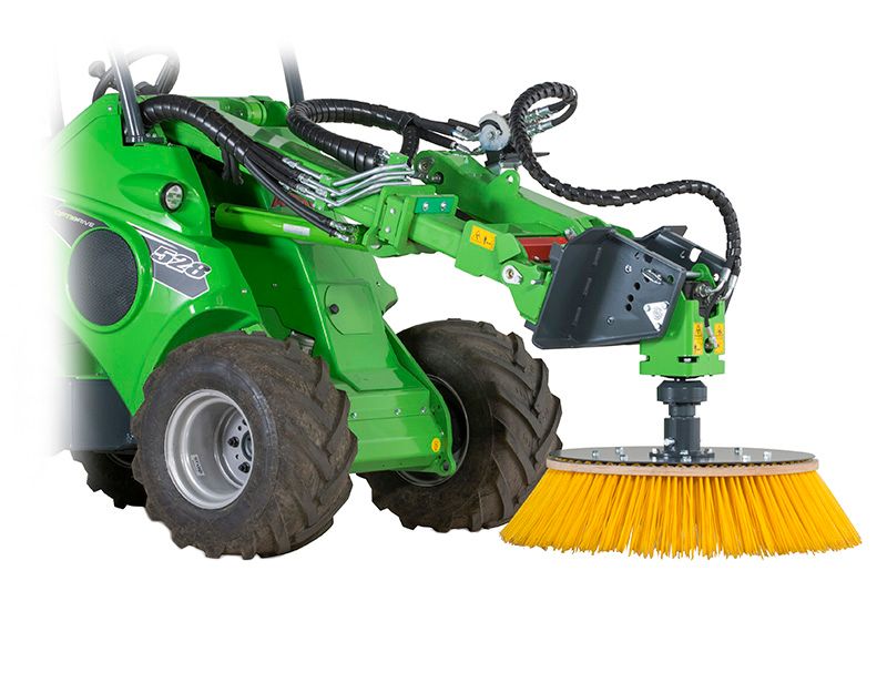 There is also a 90 degree angle adapter available as an option, on which the drive unit can be mounted. It turns the the drive unit 90° to the left or right. This means that for instance the carousel broom sweeps on the left/right side of the loader, and the cable/hose reel is crosswise to the loader and winds the cable longitudinally (in parallel to the loader).