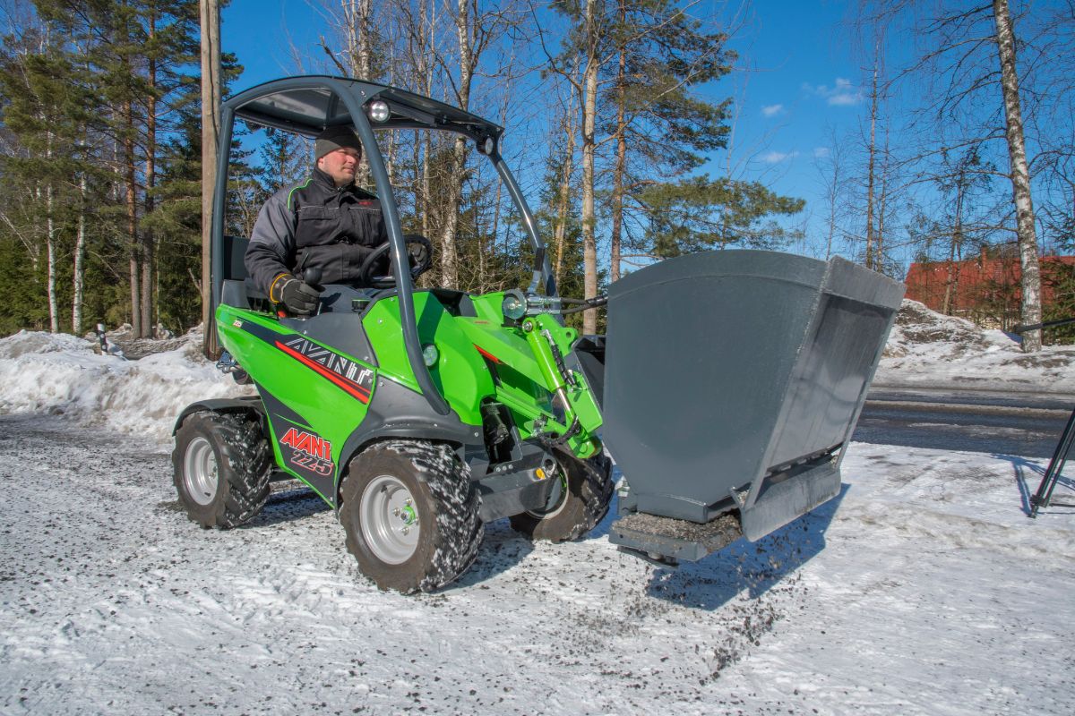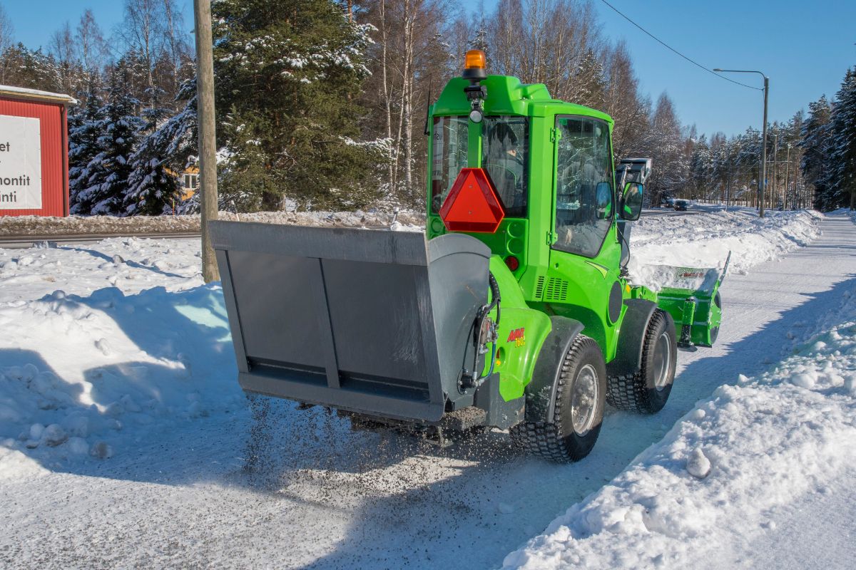 - Pendulum type sand/salt spreader spreads 200-300 mm wider than the spreader’s own width
