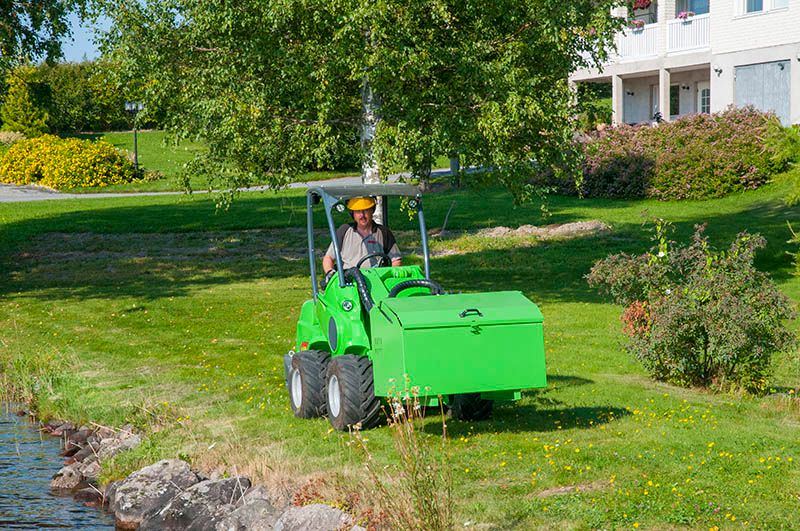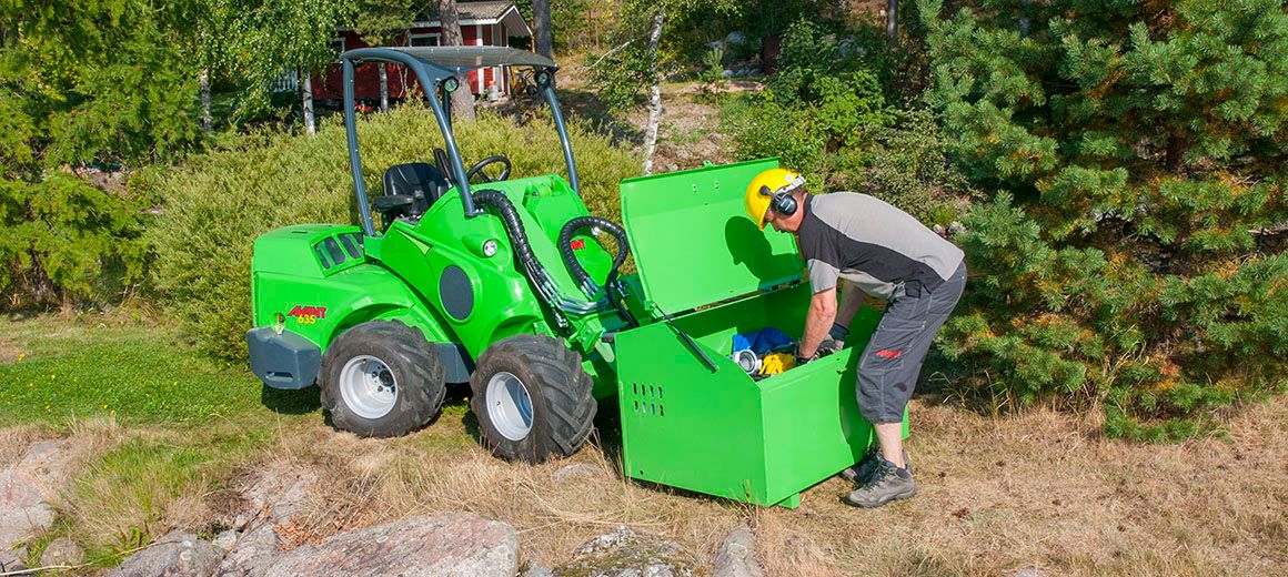 This robust and versatile toolbox mounts on the attachment coupling plate and can be transported with Avant to the worksite. The flat reinforced cover can be used as a workbench. A screw vice can be also be mounted on the box..