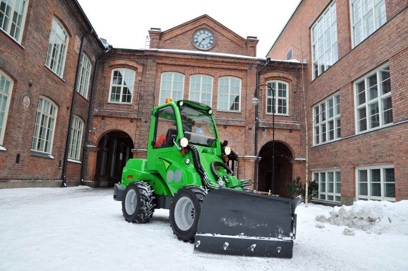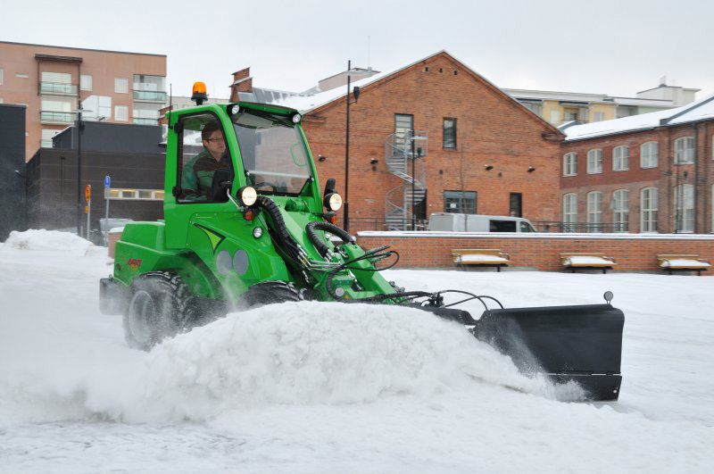 Avant snow plow is a versatile attachment for snow removal. It consists of two independently hydraulically adjustable blades. The angle of the blades is adjusted with a switch from the driver’s seat. Both blades have a spring release mechanism in the lower part of the blade to prevent any sudden stop should the blade hit an obstacle. The floating mechanism on the mounting bracket guarantees that the blade follows the ground as well as possible.