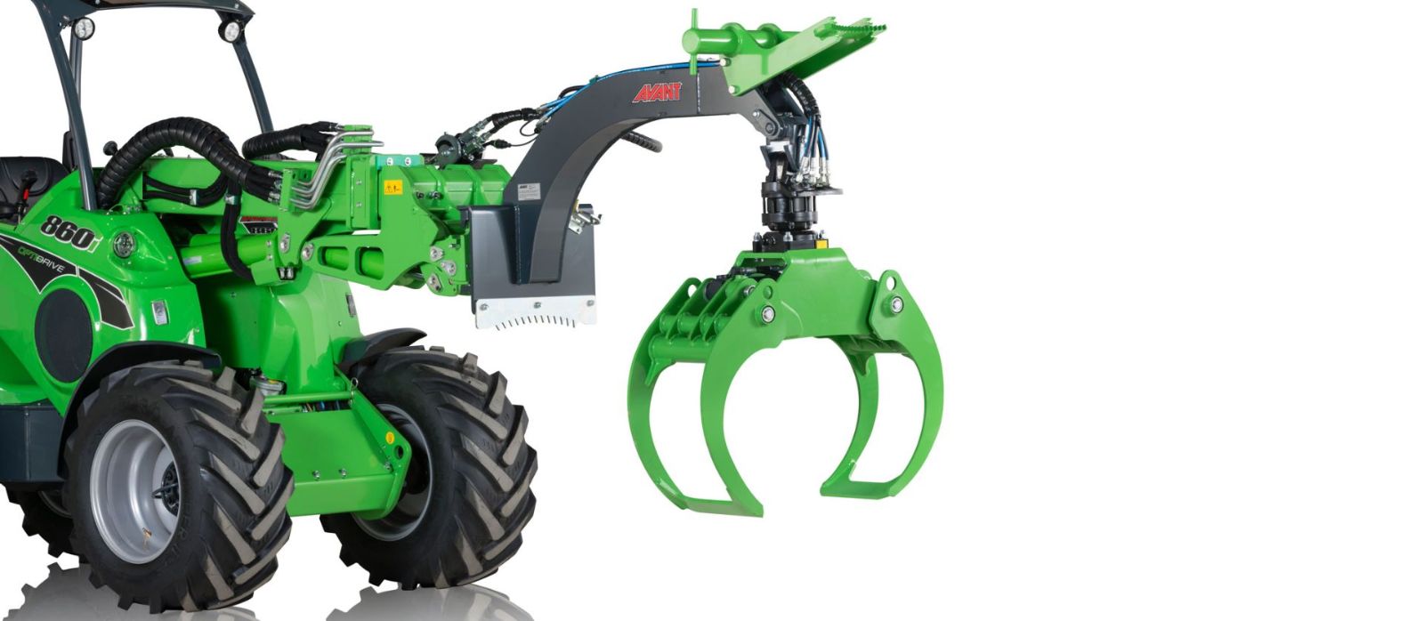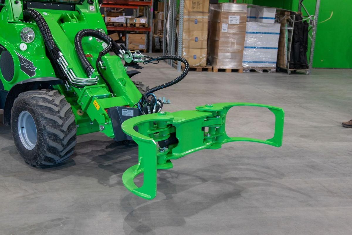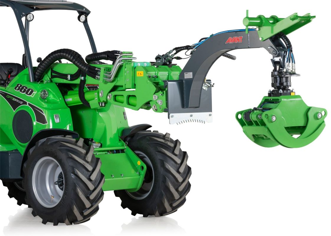 The heavy-duty timber grab is equipped with a stronger boom and hydraulic rotator and larger grapple. It is intended especially for Avant 700 and 800 series.