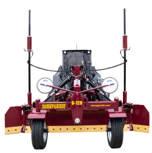 The G128 (3.25m) is the world’s first reversible grader blade with front and rear blades and hydraulic side wings, suited to large frame 90-120HP skid loaders.