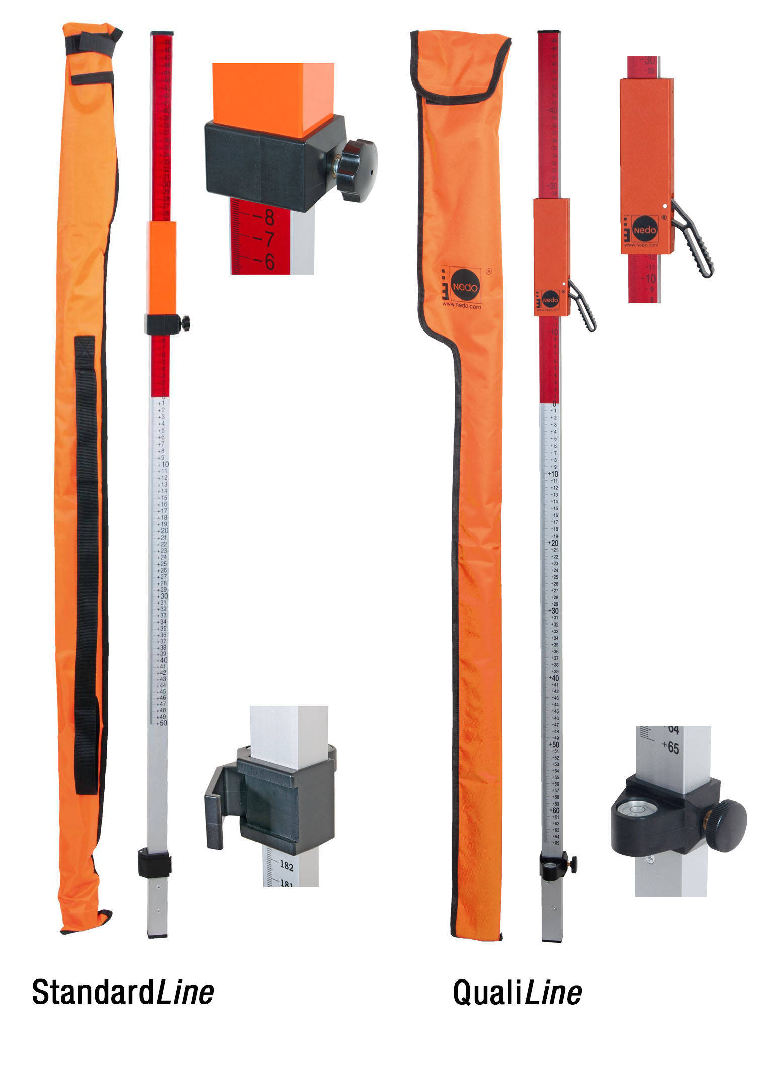 Nedo QualiLine Flexi Rods are notable for their extremely sturdy aluminium tubes and secure telescope locking mechanism. A bubble level facilitates exact vertical alignment of the rod. The mm graduation is permanently protected by subanodised printing against scratches and abrasion. The metal adapter for accommodating the laser receiver has a rugged quick-clamp device made of aluminium.